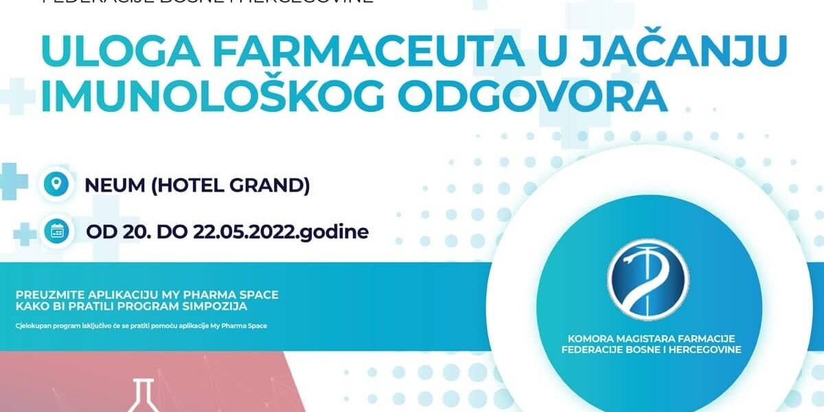Komora magistara farmacije Federacije Bosne i Hercegovine vas poziva na 14. Simpozij magistara farmacije pod nazivom “Uloga farmaceuta u jačanju imunološkog odgovora”, koji će se održati u periodu od 20.05. do 22.05.2022. godine u Neumu (Hotel Grand). Na simpozijumu je najavljen veliki broj vrhunskih stručnjaka i predavača iz prakse.