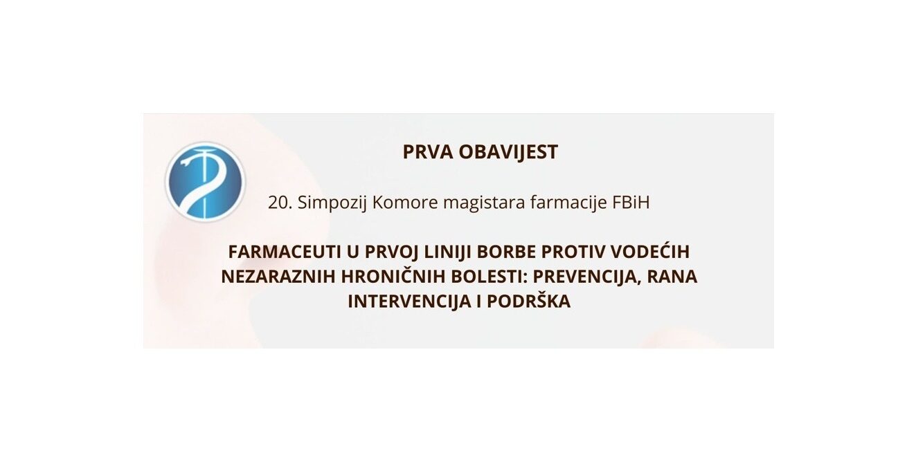 sep82025DogađajiNovostiSimpozijPRVA OBAVIJEST_20.SIMPOZIJ Categories: Događaji, Novosti, SimpozijBy Farmaceut08/09/2025 Author: Farmaceut https://farmaceutskakomora.ba/v2 Post navigationPreviousPrevious post:AKAZ poziv na edukacijuNextNext post:Pismo zdravstvenim radnicima o mjerama za smanjenje rizika od suicidalnih misli povezanih sa primjenom lijekova koji sadrže finasterid i dutasteridRelated postsObavijest o smrti prof. dr. Zlate Mujagić i komemorativnom skupu15/04/2026Farmaceut+ – stručni edukativni događaj za magistre farmacije i farmaceutske tehničare14/04/2026Svjetski dan zdravlja: Vrijeme za snažnije prepoznavanje uloge farmaceuta u zdravstvenom sistemu12/04/2026Čestitka povodom Vaskrsa12/04/2026VAŽNO OBAVJEŠTENJE ZA MAGISTRE FARMACIJE SA PODRUČJA SREDNJEBOSANSKOG KANTONA10/04/2026Svjetski dan zdravlja 7. april 2026. – Koja je uloga farmaceuta u ovom sistemu?07/04/2026