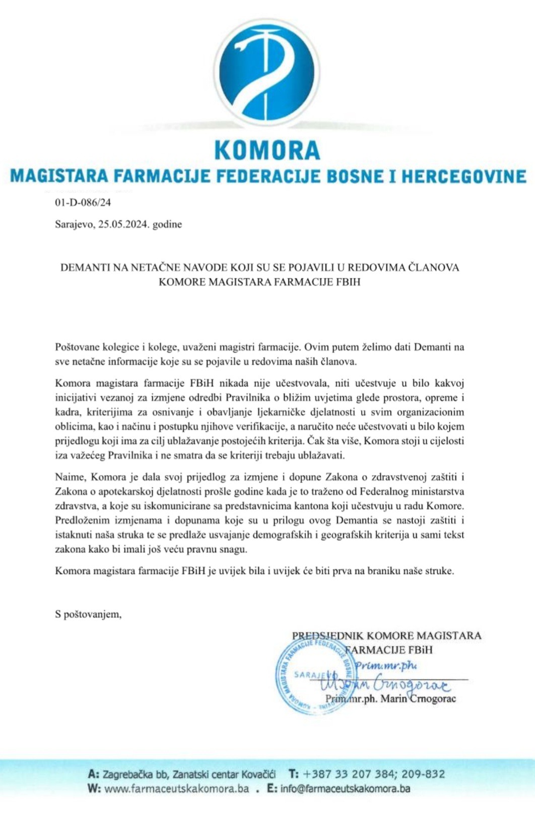 PRILOZI https://farmaceutskakomora.ba/v2/wp-content/uploads/2024/05/Izmjene-zakona-o-zdr-zastiti-komora1.pdf https://farmaceutskakomora.ba/v2/wp-content/uploads/2024/05/Final-Prijedlozi-dopuna-Zakona-o-apotekarskoj-djelatnosti^J-Komora-FBiH.pdf Category: NovostiBy Farmaceut25/05/2024 Author: Farmaceut https://farmaceutskakomora.ba/v2 Post navigationPreviousPrevious post:DRUGA OBAVIJEST 17. SIMPOZIJ KOMORE MAGISTARA FARMACIJE FBIHNextNext post:Ljekarnička zdravstvena Ustanova BIOPHARM Neum, raspisuje natječaj za radno mjestoRelated postsObavijest o smrti prof. dr. Zlate Mujagić i komemorativnom skupu15/04/2026Farmaceut+ – stručni edukativni događaj za magistre farmacije i farmaceutske tehničare14/04/2026Svjetski dan zdravlja: Vrijeme za snažnije prepoznavanje uloge farmaceuta u zdravstvenom sistemu12/04/2026Čestitka povodom Vaskrsa12/04/2026VAŽNO OBAVJEŠTENJE ZA MAGISTRE FARMACIJE SA PODRUČJA SREDNJEBOSANSKOG KANTONA10/04/2026Svjetski dan zdravlja 7. april 2026. – Koja je uloga farmaceuta u ovom sistemu?07/04/2026